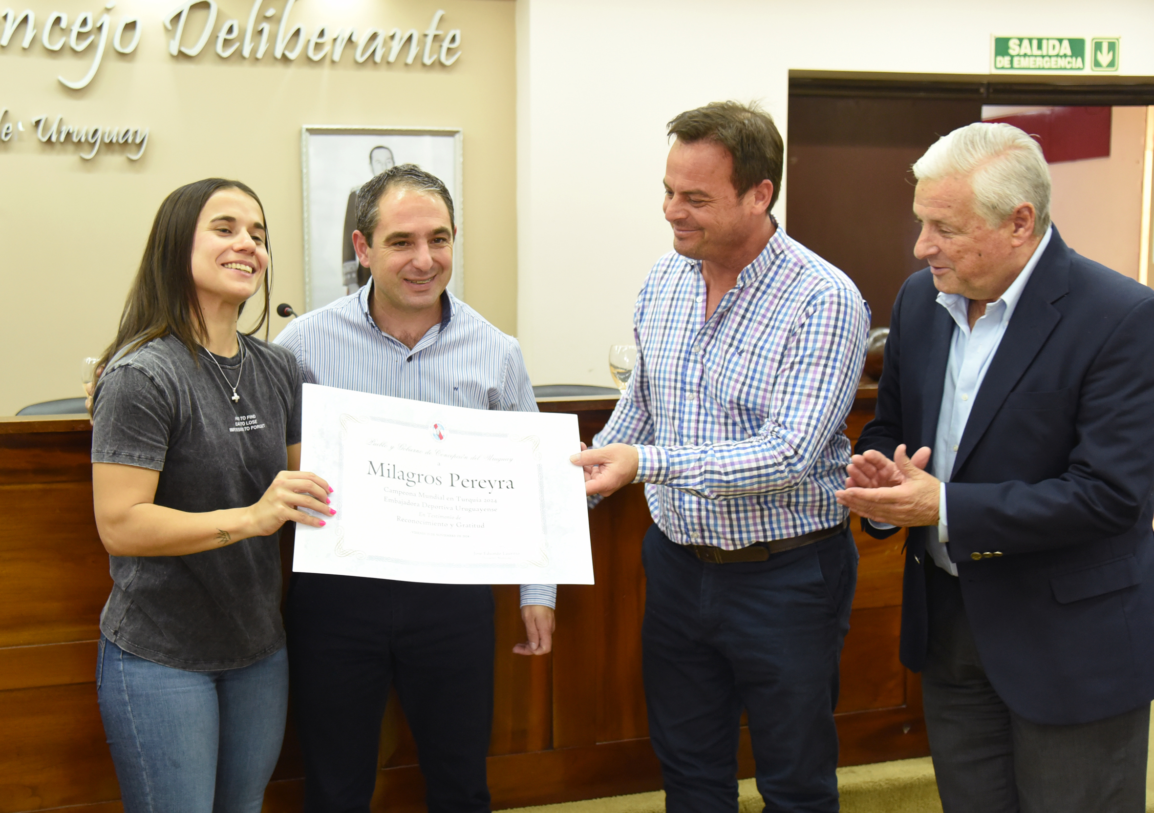 El intendente José Lauritto y la presidenta del Concejo, Rossana Sosa Zitto, manifestaron el agradecimiento de la comunidad uruguayense a la campeona mundial y le obsequiaron recordatorios.
