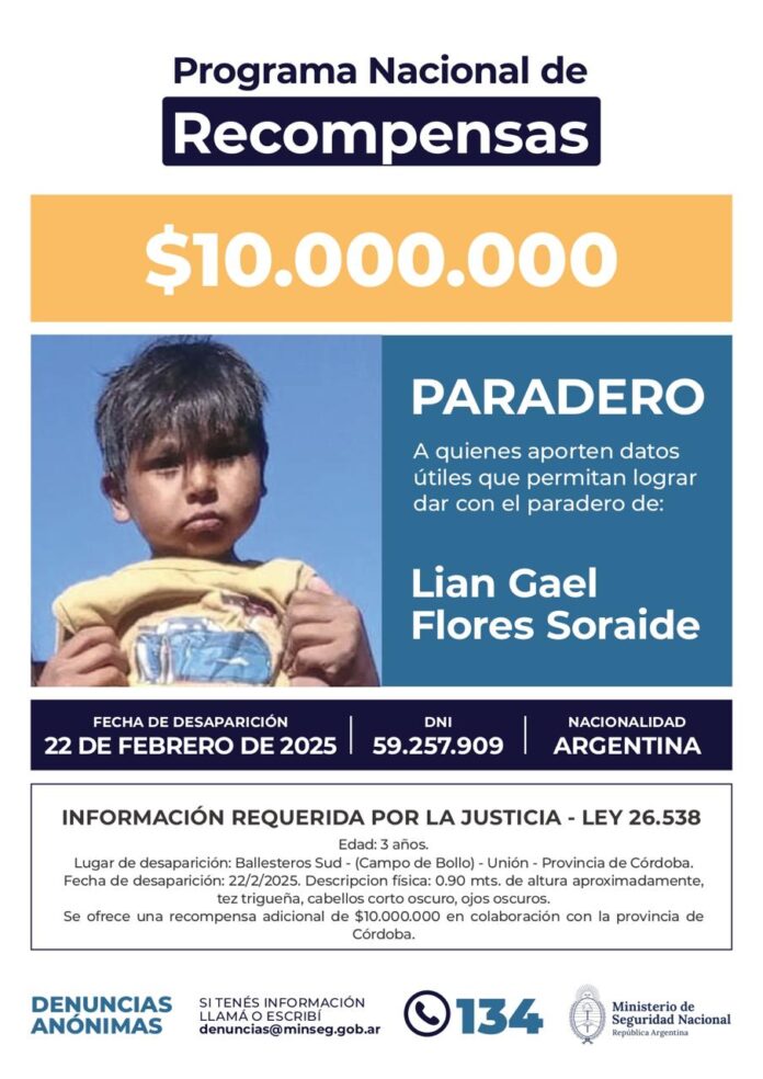 El Ministerio de Seguridad de Argentina colabora con Córdoba en la búsqueda de Lian Gael Flores Soraide, el niño desaparecido en la zona rural de Ballesteros Sud desde el sábado 22 de febrero. En ese marco, el Gobierno de esa provincia, con el apoyo de la cartera nacional, ofrecen una recompensa de $20 millones de pesos para quien aporte datos certeros que permitan encontrarlo.