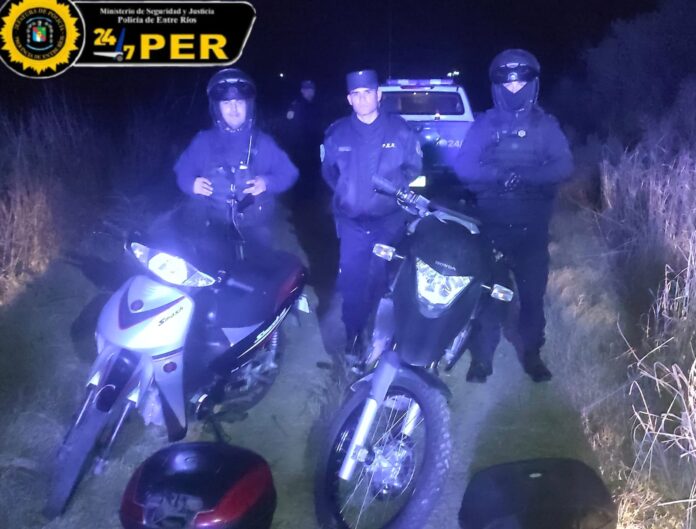 A las 23:00 horas de este lunes, personal del Comando Radioeléctrico, al momento de encontrarse realizando tareas preventivas, logró localizar y secuestrar dos motocicletas con pedido de secuestro. Ocurrió en la zona de la colectora oeste de la Autovía Gervasio Artigas, en el kilómetro 124, en inmediaciones al arroyo La China. Los vehículos se encontraban ocultos entre malezas, informaron desde la policía de Entre Ríos.