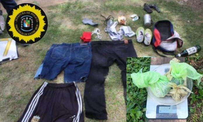 Durante la requisa, los efectivos secuestraron la pistola de juguete de plástico con su funda, una mochila con las bebidas alcohólicas sustraídas y dinero en efectivo, un cuchillo, indumentaria variada y siete envoltorios de marihuana (lo que motivó la intervención de la División Drogas Peligrosas).