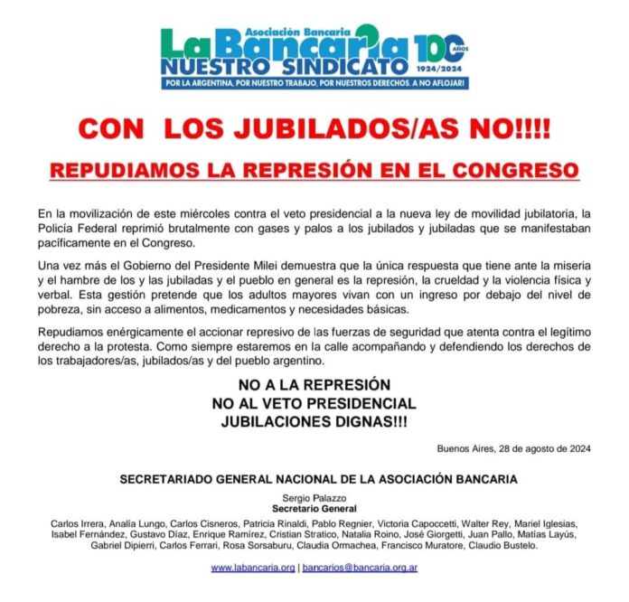 La Asociación Bancaria de Concepción del Uruguay difundió el comunicado enviado por su Secretariado General Nacional a través del cual se menciona que “en la movilización de este miércoles 29 contra el veto presidencial a la nueva ley de movilidad jubilatoria, la Policía Federal reprimió brutalmente con gases y palos a los jubilados y jubiladas que se manifestaban pacíficamente en el Congreso. Una vez más el gobierno del presidente Milei demuestra que la única respuesta que tiene ante la miseria y el hambre de los y las jubiladas y el pueblo en general es la represión, la crueldad y la violencia física y verbal. Esta gestión pretende que los adultos mayores vivan con un ingreso por debajo del nivel de pobreza, sin acceso a alimentos, medicamentos y necesidades básicas”.