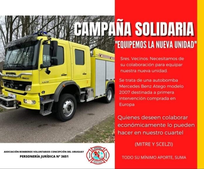 «Equipemos la nueva unidad» denominaron los Bomberos Voluntarios de Concepción del Uruguay a la campaña solidaria. «Queridos vecinos: Necesitamos equipar nuestra nueva autobomba marca Mercedes Benz Atego 1328, Modelo 2007 comprada en Europa por nuestra Asociación con fondos propios y un aporte de la Municipalidad de Concepción del Uruguay con la suma total de € 65.000 euros», informaron.