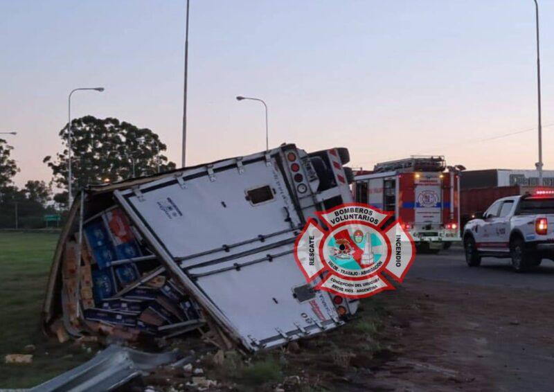 Un camionero de 32 años resultó con lesiones leves tras volcar el camión Iveco 420 que conducía en la rotonda «La Chamarrita» de la Autovía General Artigas, en la madrugada de este jueves, y permaneció atrapado en la cabina durante casi dos horas hasta ser rescatado por Bomberos Voluntarios.