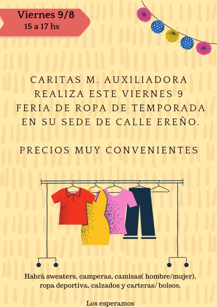 Desde Cáritas María Auxiliadora hizo saber que este viernes 9, de 15:00 a 17:00, en su sede de calle Ereño, llevará adelante la feria de ropa de temporada a precios muy convenientes. Habrá sweaters, camperas, camisas, indumentaria deportiva, calzados, carteras y bolsos.