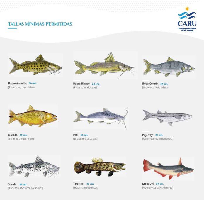 Por este motivo se recuerda al público que desarrolla actividades de pesca en aguas de la cuenca del río Uruguay, que deben respetar estrictamente la normativa acerca de las tallas mínimas de captura de las especies mencionadas en la siguiente Tabla. Individuos por debajo de esas longitudes deben ser devueltos al agua sin excepción y no pueden ser comercializados bajo ningún concepto.