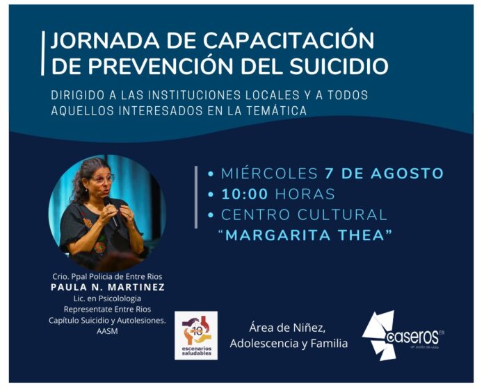 Este miércoles 7 de agosto, a las 10:00, en el Centro Cultural Margarita Thea, se llevará adelante la Jornada de capacitación de prevención del suicidio, destinada a las instituciones locales y abierta al público en general. Estará a cargo de la comisario principal de la Policía de Entre Ríos, licenciada en Psicología Paula Martínez.