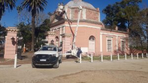 La Municipalidad de Caseros, a través del personal de Obras y Servicios Públicos, brindó colaboración con el hidroelevador para que los empleados del Palacio San José puedan efectuar la limpieza de la cúpula de la Capilla y el corte de árboles de gran magnitud.
