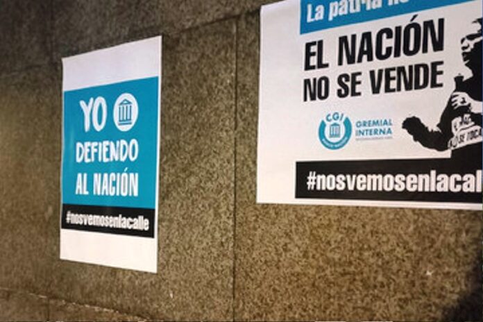 carteles en el edificio del banco nación en plaza de mayo contra su privatización foto Marcelo Carroll