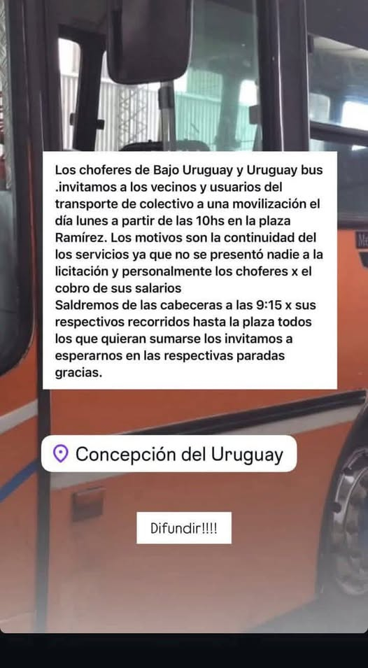Los choferes de las líneas de colectivo Bajo Uruguay y Uruguay Bus convocan a una manifestación este lunes a partir de las 10 horas en plaza Ramírez, para reclamar el pago de sus salarios y la continuidad del servicio tras la falta de postor en una licitación.