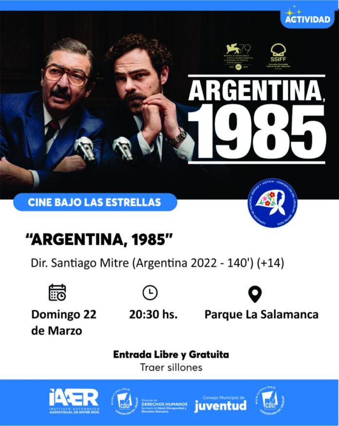 El domingo 22 de marzo a las 20:30 horas se realizará una nueva edición del ciclo «Cine Bajo las Estrellas» en el Parque La Salamanca de Concepción del Uruguay, con la proyección gratuita de la película «Argentina, 1985», un drama histórico que reconstruye el Juicio a las Juntas de la última dictadura cívico-militar.