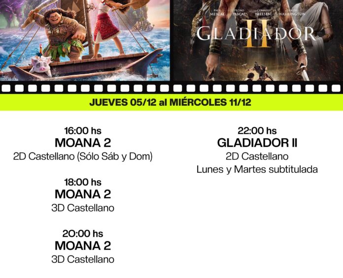 La programación, vigente hasta el miércoles 11, inclusive, se iniciará diariamente a las 18:00 y a las 20:00 con Moana 2, en 3D y castellano.