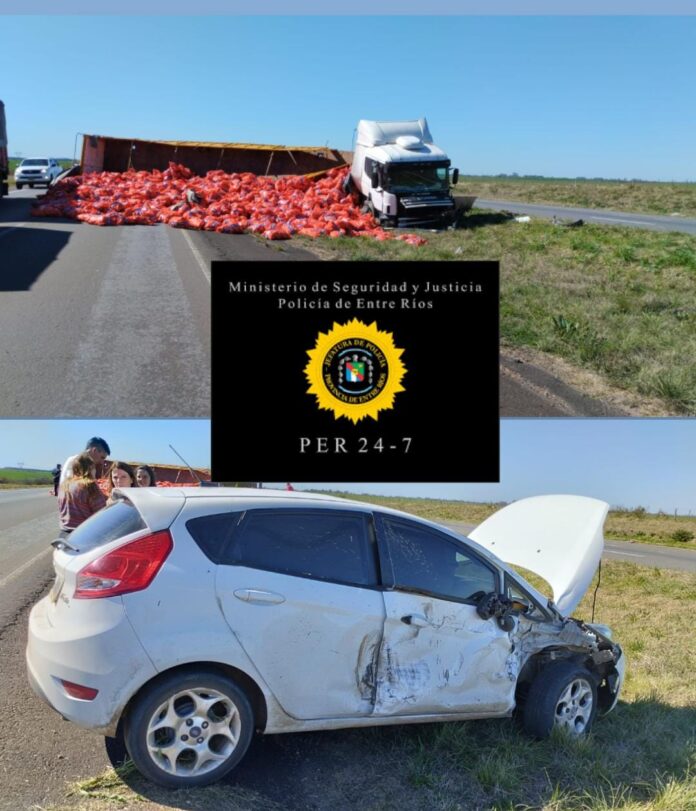 Durante la tarde de este sábado, aproximadamente a las 14:30 horas, se produjo un siniestro vial en la Autovía Artigas, a la altura del kilómetro 97. El incidente involucró a un camión que transportaba bolsas de cebolla y un automóvil particular, sin que se registraran personas lesionadas; comunicaron desde la policía de Entre Ríos.