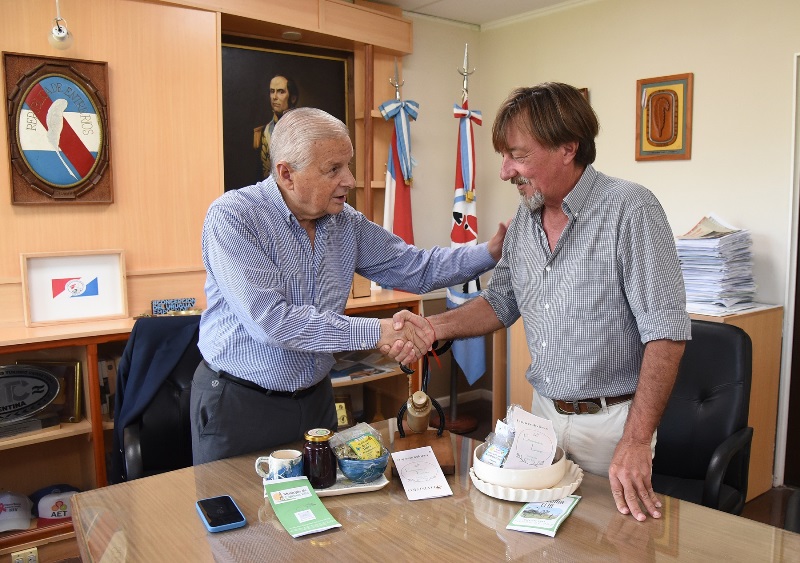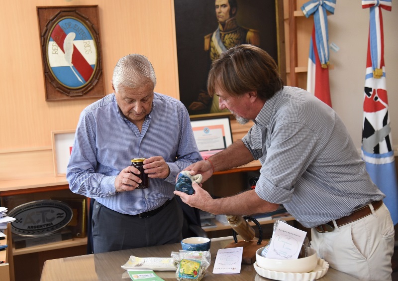 En el marco de la celebración, los emprendedores locales tuvieron un rol destacado, mostrando parte de su producción. Como continuidad de ese reconocimiento, este lunes el intendente de Colonia Elía, Ramón Barrera, hizo entrega de algunos de esos productos al intendente de Concepción del Uruguay, José Lauritto.