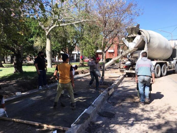 La puesta en valor de Plaza Urquiza incluye una nueva vereda en todo su perímetro. Para ello comenzó el tendido de hormigón. Se sumarán otras mejoras que integran la primera etapa.