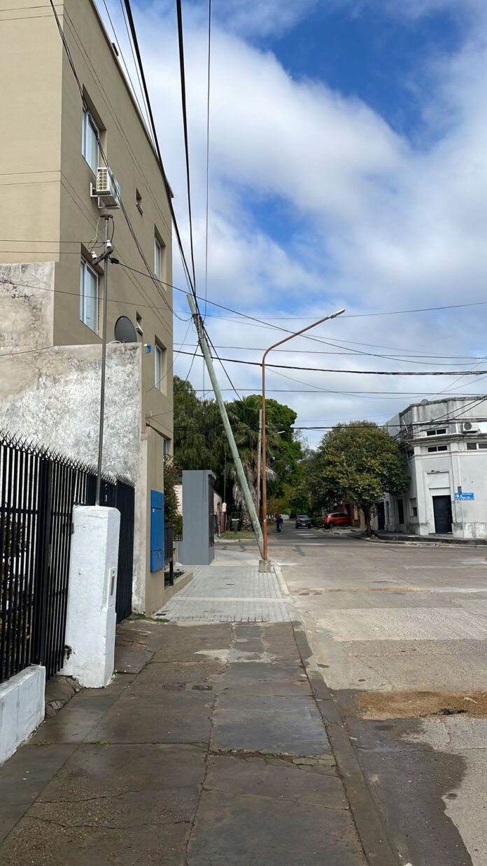 El poste se encuentra al borde de caerse en las intersecciones de calles de Ituzaingó y 25 de Mayo. Según pudo saber La Calle «quedó así por un camión que cuando dobló, lo tocó y lo tumbó, parece que se partió la base», nos informaron.