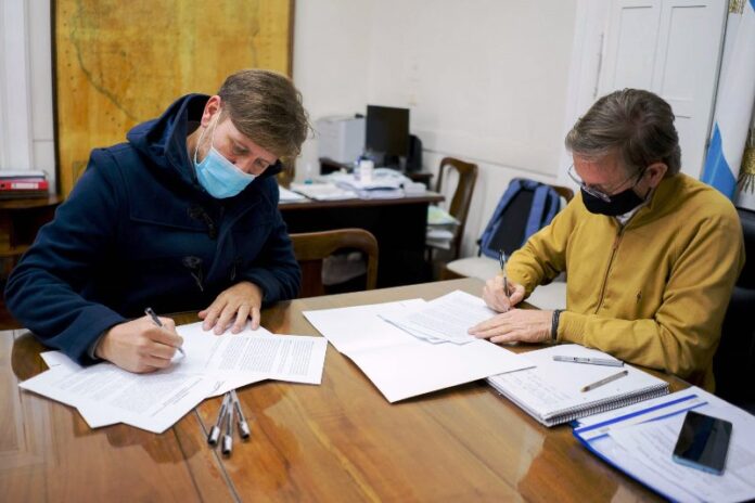 El director ejecutivo del Becario, Sebastián Bértoli, y el ministro de Producción, Juan José Bahillo, rubricaron este lunes acuerdos y ambos organismos se comprometieron a impulsar una dinámica de cooperación interinstitucional para trabajar sobre el desarrollo industrial, comercial, ambiental y socioeconómico, promoviendo la inserción de los estudiantes entrerrianos en el trabajo y la producción, y actualizando el mapa de las carreras prioritarias.