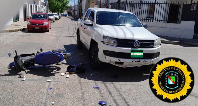 Un siniestro vial ocurrió esta tarde, a las 14:10 horas, en la esquina de las calles Posadas y Carosini, que involucró a una motocicleta y una camioneta. Uniformados del Comando Radioeléctrico intervinieron en el lugar del accidente.