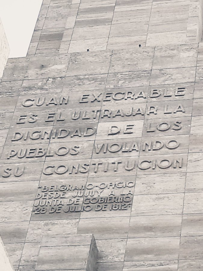 Por un lado el malestar por la dictadura se me volvía cada vez más ominoso. El año anterior, en el desfile militar junto al Monumento a la Bandera, la satisfacción patriótica se me hizo esquiva. Detrás de Videla en el palco se leía a Belgrano escrito en la piedra: “Cuán execrable es el ultrajar la dignidad de los pueblos violando su Constitución.”