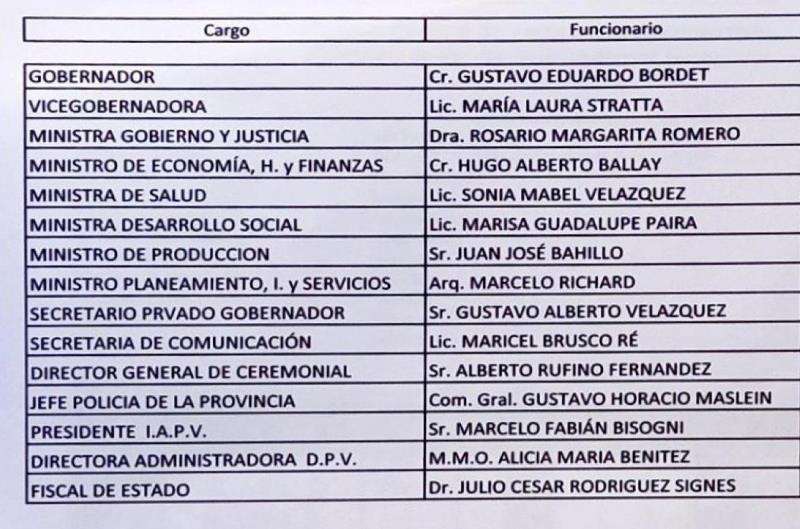 Entre los nombres aparecen el Gobernador, los Ministros de las distintas carteras y también los titulares de los entes descentralizados.