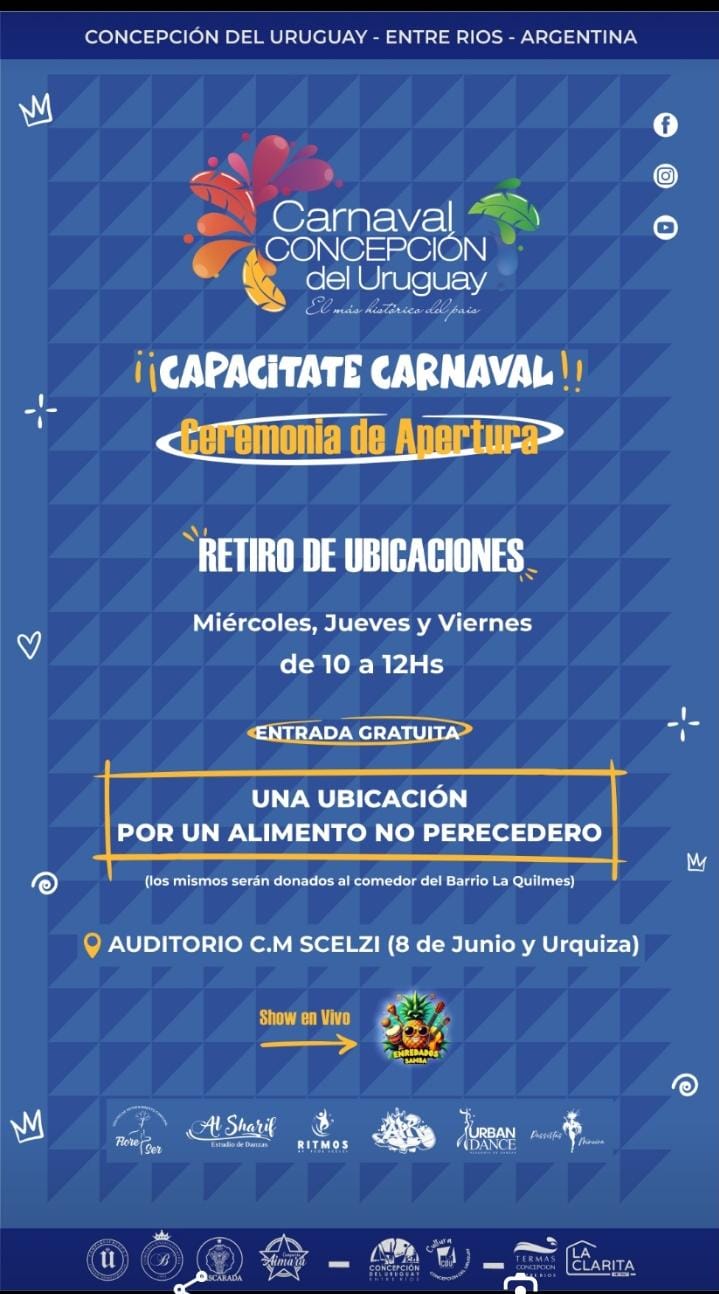 La Comisión de Carnaval de Concepción del Uruguay invitó a participar de ‘Capacitate Carnaval’. La edición 2024 se llevará a cabo este viernes 13, sábado 14 y domingo 15 de septiembre con una entrada gratuita por un alimento no perecedero.