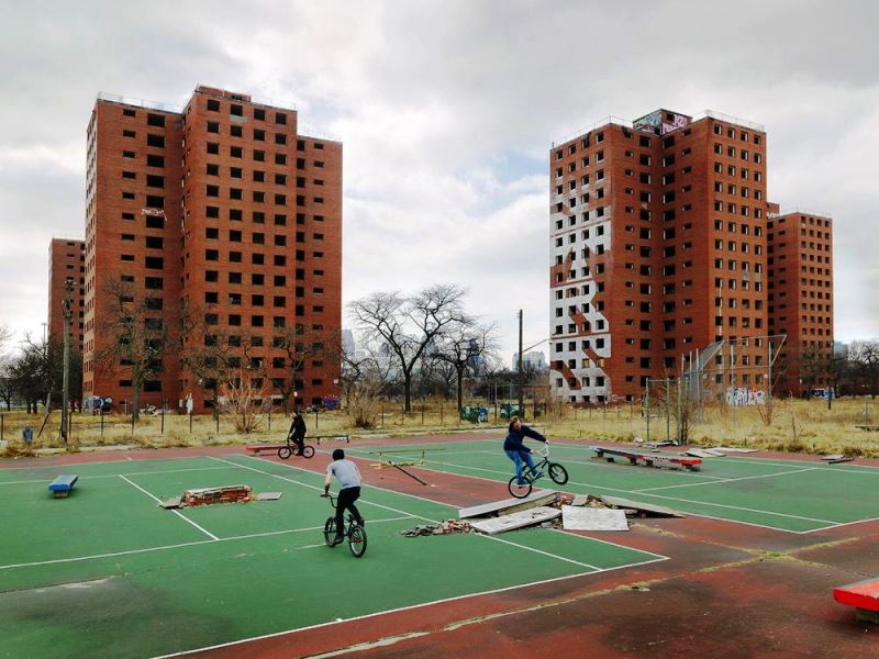 Pie de foto: Jóvenes practican MTB en una antigua cancha de tenis en Eastside, Detroit. Detrás, el abandonado Brewster-Douglass, el primer complejo de viviendas para afrodescendientes financiadas por el Estado en 1935.