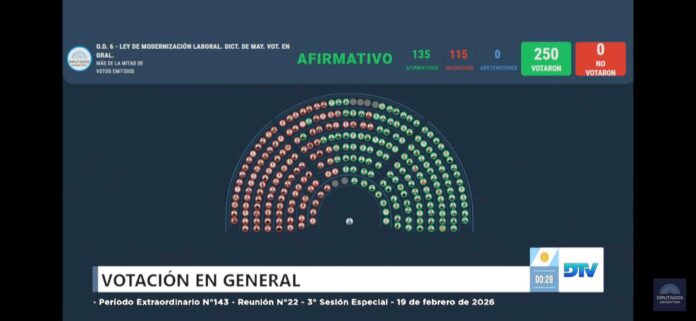 En una jornada marcada por un paro de la CGT sin movilización, una marcha de gremios combativos al Congreso que terminó con represión, y fuertes cruces en el recinto, La Libertad Avanza (LLA) obtuvo este jueves la media sanción en Diputados a la reforma laboral con 135 votos a favor, 115 en contra y ninguna abstención.