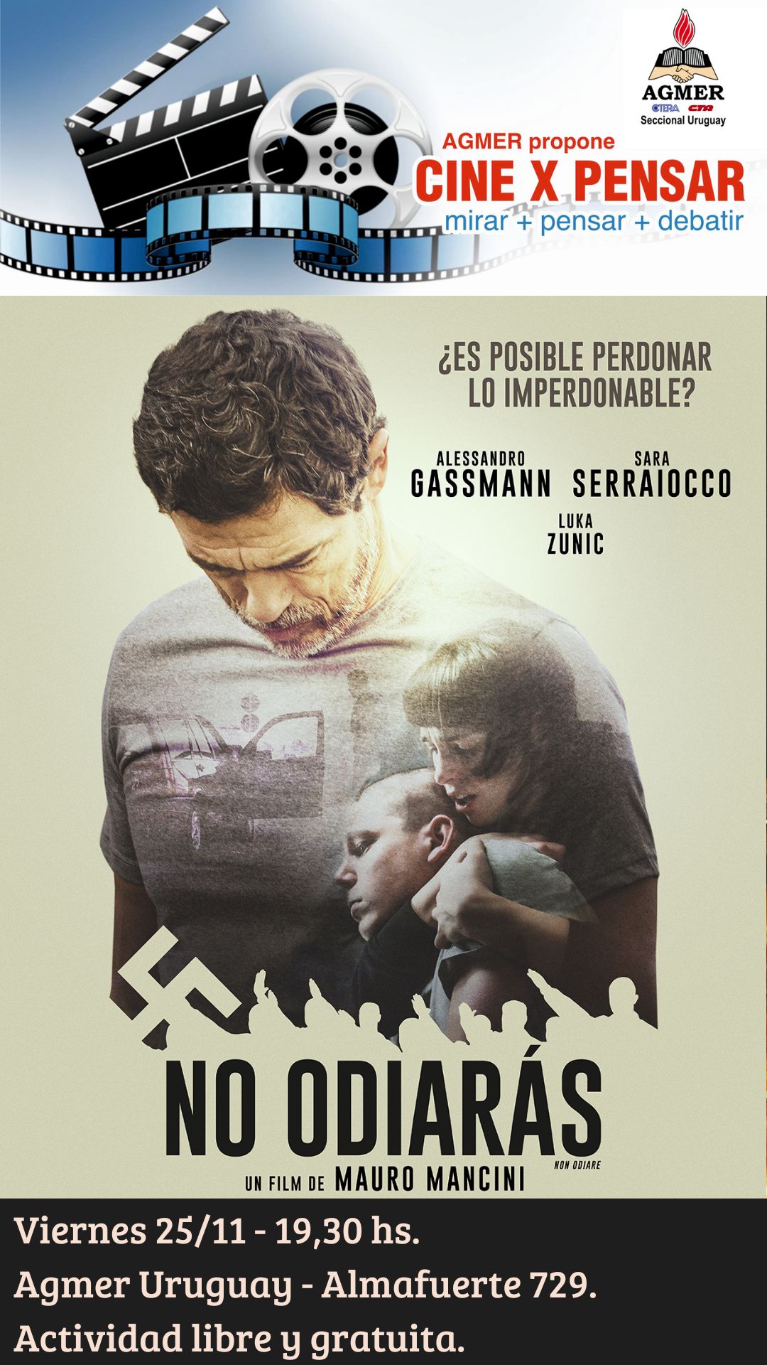 En esta oportunidad, se proyectará la película italiana «No odiarás», que gira en torno al dilema del odio racial heredado en los grupos neonazis actuales.
