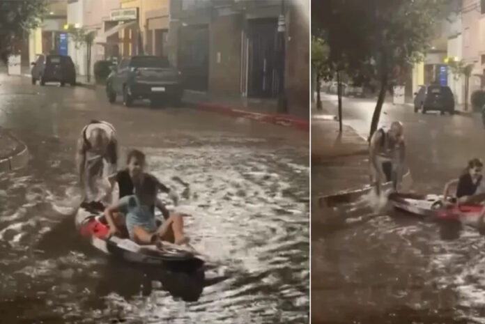 A través de sus redes sociales, compartió imágenes en las que se lo ve jugando con sus hijas en una calle céntrica de la ciudad, donde el agua acumulada por las precipitaciones cubría gran parte de la calzada. En las fotografías, el músico acompaña a las niñas mientras se divierten con el agua.