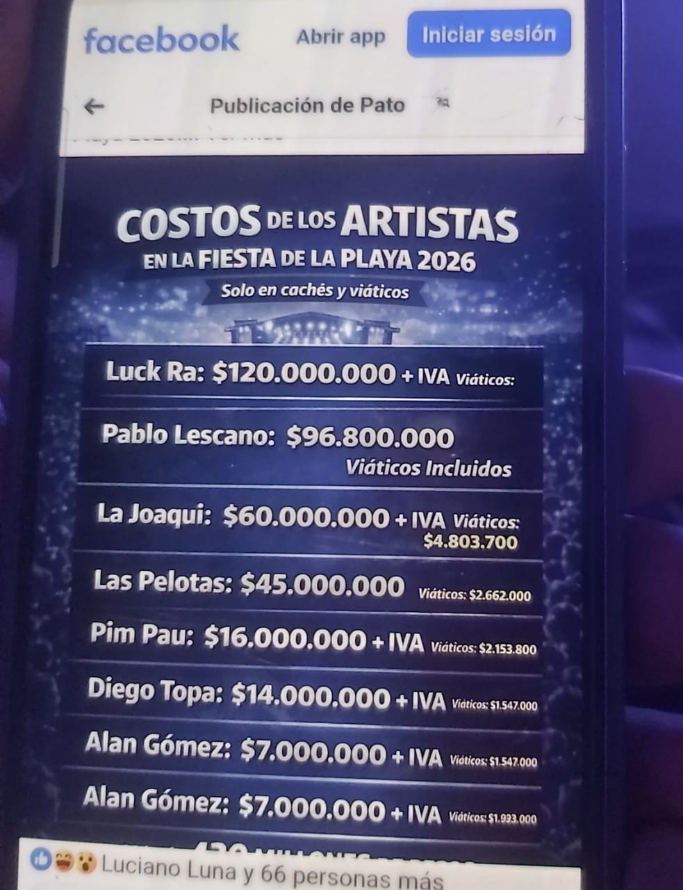 El mayor monto corresponde al cantante Luck Ra, quien habría cobrado 120 millones de pesos más IVA, sin que se especifique el costo total de sus viáticos. Pablo Lescano aparece en segundo lugar con un pago de 96,8 millones de pesos, con viáticos incluidos. La lista continúa con La Joaqui, que percibió 60 millones de pesos más IVA y 4,8 millones en viáticos, Las Pelotas con 45 millones y 2,6 millones en traslados, Pim Pau con 16 millones más IVA y Diego Topa con 14 millones más IVA.