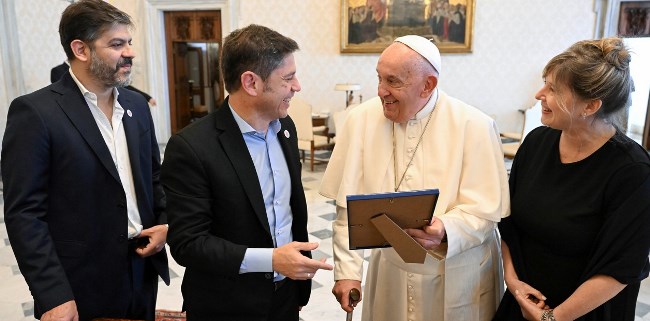 El papa Francisco recibió hoy en el Vaticano al gobernador de la provincia de Buenos Aires, Axel Kicillof, mientras se definía el futuro de la Ley Bases en el Senado.