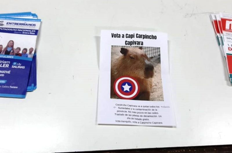 Por su parte, en Colón, los carpinchos ingresaron en la boleta que aparecieron en dos mesas de la Escuela N° 60, según informaron a ERA Verde. La boleta que muchos electores encontraron en las mesas decía: “Carpincho Capibara va a quitar todos los problemas en los humedales y la contaminación de la provincia. No más pozos en las calles. Traslado de las piletas de decantación. Un día de helado gratis. Vota tranquilo, vota a Carpincho Capibara”.