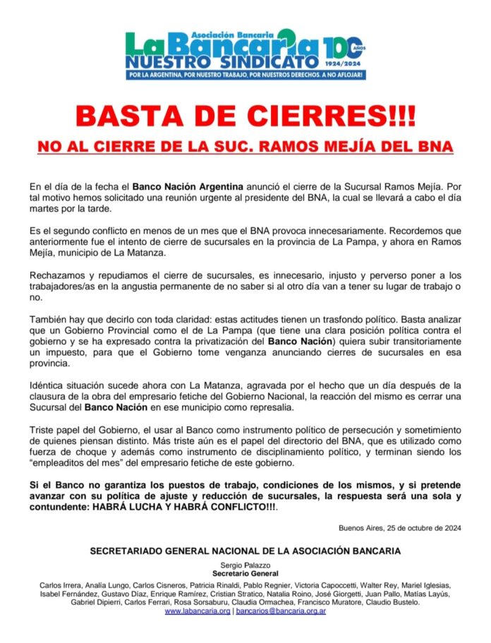 La Asociación Bancaria de Concepción del Uruguay compartió el comunicado, emitido por su Secretariado Nacional General. Bajo el título de: ‘¡Basta de cierres!, el escrito señala que “el Banco de la Nación Argentina (BNA) anunció el cierre de la Sucursal Ramos Mejía. Por tal motivo hemos solicitado una reunión urgente al presidente del BNA, que se llevará a cabo el día martes por la tarde. Es el segundo conflicto en menos de un mes que el BNA provoca innecesariamente. Recordemos que anteriormente fue el intento de cierre de sucursales en La Pampa y ahora el de Ramos Mejía, municipio de La Matanza. Rechazamos y repudiamos el cierre de sucursales, es innecesario, injusto y perverso poner a los trabajadores/as en la angustia permanente de no saber si al otro día van a tener su lugar de trabajo o no”.
