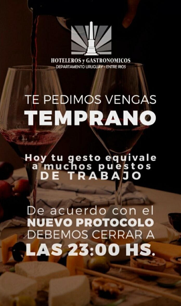 Mediante comunicados en las redes sociales «Hoteleros y Gastronómicos del Departamento Uruguay, Entre Ríos» expresan «Te pedimos que vengas temprano».