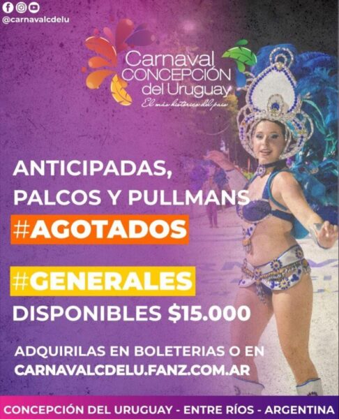 La última noche del Carnaval de Concepción del Uruguay, prevista para este sábado, tiene gran expectativa con las entradas anticipadas, palcos y pullman agotados, y promete un marco multitudinario en el corsódromo.