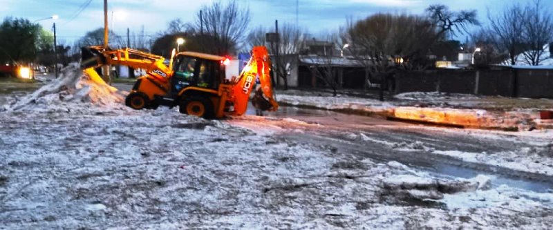 El periodista y director de Nueva Zona, Fabricio Bovier, confirmó que “a las 4:57 de ayer se escuchó un fuerte estruendo y a partir de ahí fue incesante por 20 o 25 minutos la caída de granizo”. “Hablando con gente mayor, de 70-80 años, no se recuerda un fenómeno de estas características en la historia de la ciudad. El granizo en general es por un periodo corto, de tres minutos, pero hoy fue una excepción”, relató en declaraciones realizadas en A Quien Corresponda (Radio De la Plaza). Puntualizó que las piedras rompieron “techos, ventanas, claraboyas, tapó todos los desagües de techos de viviendas, y obviamente los vehículos que estaban estacionados en la calle sufrieron daños”. Mencionó que “pasadas las 8:00 sufrieron las consecuencias con varias calles todavía tapadas por el granizo” y, por ello, trabajaban con maquinas municipales para despejarlas. Estimó que “para mediodía el problema en las calles y los desagües tapados quedaría resuelto, pero obviamente queda asistir a algunas familias por parte de provincia y municipio donde ingreso agua en las viviendas y se mojaron colchones, ropa y muebles”. Por su parte, el intendente Carlos Weiss, aseguró: “Nos sorprendió una tormenta de granizo que fue muy extensa y causó daños importantes a las viviendas particulares y principalmente a la gente de menos recursos ya que por la obstrucción de los desagües pluviales se inundaron las viviendas, por eso ahora se están limpiando”. “No fueron trastornos tan importantes pero sí obviamente hubo trastornos en el tránsito y se inundaron algunos domicilios aledaños a los desagües porque hay prácticamente un metro de piedras acumuladas en una cuadra”, refirió. Ante esto, confirmó que “se asistió a las personas, nos comunicamos con el Ministerio de Desarrollo Social y estamos asistidos con ellos para ayudar a los damnificados. No hay evacuados pero sí muchos reclamos por daños para pedir colchones, frazadas, etcétera y que hubo daños en electrodomésticos de los domicilios particulares”. Acotó que “en los edificios públicos tuvimos el mismo inconveniente por la obstrucción de los desagües pluviales como el edificio central del municipio y Promoción social que se inundaron, se mojó algo de documentación y computadoras, así que estamos trabajando para restablecer el servicio lo antes posible”. Por último, sostuvo que “había alerta amarilla por vientos fuertes, lluvias y algo de granizo pero no se puede prever un factor climático como esto, es totalmente anormal nunca en la historia había ocurrido algo similar”.