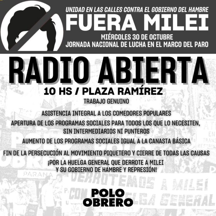 Puntualmente en Concepción del Uruguay, el Polo Obrero, convocó a una radio abierta, a realizarse desde las 10:00, en la plaza Ramírez, bajo el lema: ‘Fuera Milei’.