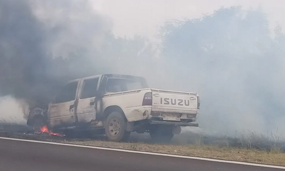 Tres ocupantes lograron evacuar a tiempo una camioneta Isuzu que se incendió este domingo en la Autovía 12, provocando también la quema de pastizales en la banquina; bomberos controlaron las llamas sin registrarse heridos.