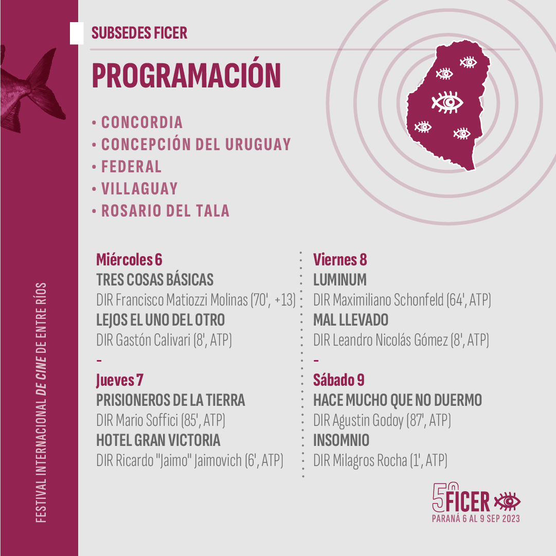 El primer día del FICER – miércoles 6 de septiembre – se proyectará el largometraje Tres cosas básicas, y el cortometraje entrerriano Lejos el uno del otro. El jueves 7 será el turno de Prisioneros de la Tierra y Hotel Gran Victoria. El viernes 8 la función agrupa las películas Luminum y Mal Llevado. Finalmente y el sábado será el turno de Hace mucho que no duermo; e Insomnio.