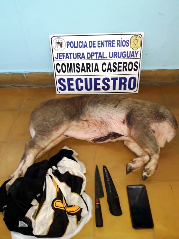 De acuerdo a la misma fuerza, de allí se realizaron en forma conjunta, con personal de Comisaria San Justo, las averiguaciones del caso a los efectos de dar con los autores. Estas dan resultado positivo, ya que más tarde se realizó un procedimiento en una vivienda, donde se secuestraron: dos cuchillos, un porcino de unos 15 kilos aproximadamente e indumentaria. También se incautó telefonía celular para ser peritada.