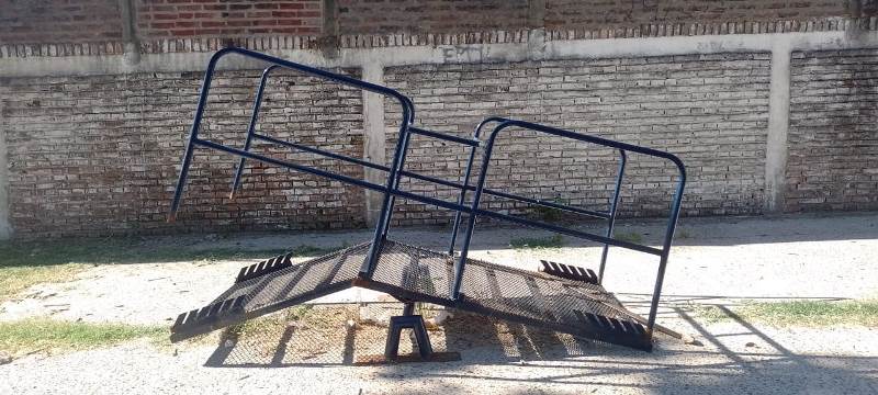 El segundo juego, ubicado a pocos metros, consiste en una estructura horizontal similar a un sube y baja adaptado para dos personas en sillas de ruedas, dispuestas de manera enfrentada. Este dispositivo se encuentra inutilizado debido a múltiples daños, entre ellos la rotura y desprendimiento de uno de los extremos, lo que impide cualquier uso y representa un peligro evidente.
