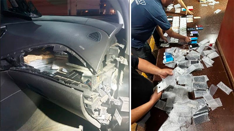Continuando con la revisión, el personal de la Aduana levantó una pequeña tapa en el sector del torpedo del vehículo, donde se encuentran los airbags, y encontraron bultos acondicionados en bolsas de plástico. En efecto, resultaron ser 116 teléfonos celulares iPhone, con sus respectivos accesorios, valuados en más de $30 millones, junto con 12.520 dólares, también ocultos.