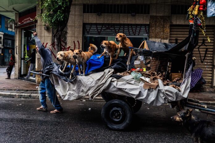 Un hombre recorre la Rua Vitória, del distrito de Cracolandia, en el centro de San Pablo. Hoy en día, esta zona —conocida durante décadas como un centro del narcotráfico— se asemeja a un pueblo fantasma. Las autoridades del estado gobernado por el bolsonarista Tarcísio de Freitas, han utilizado la guerra contra las drogas como pretexto para la gentrificación. En lugar de las casas antiguas, se han construido nuevos edificios y muchos residentes de bajos ingresos han sido desalojados de sus hogares. Para muchos, sus carros constituyen una herramienta para sobrevivir y un techo, mientras los edificios que antes los acogían están siendo demolidos para dar paso a complejos de viviendas modernos. Cracolandia encarna tanto la resiliencia como contradicción: una comunidad urbana contemporánea y una realidad infernal de la que escapar. Un territorio que no revela la raíz de los males sociales, sino sus dolorosos síntomas.