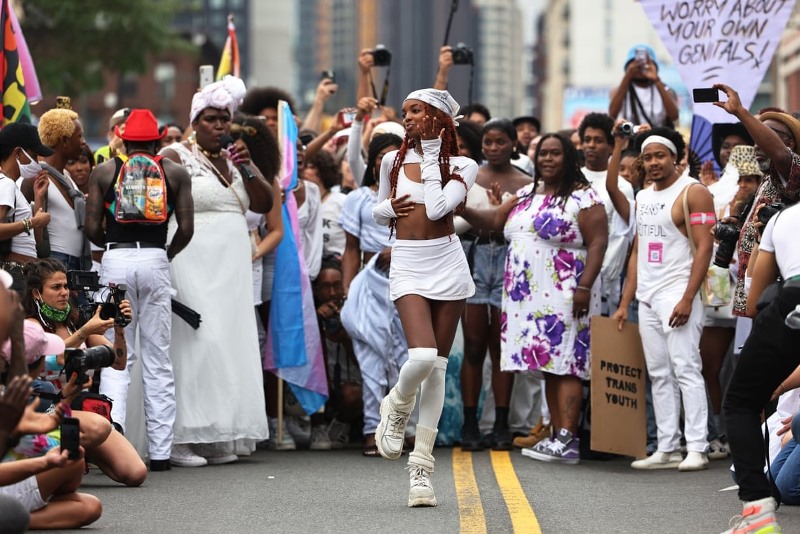 La gente camina por una pasarela improvisada durante la Marcha de Liberación de Brooklin, un evento como respuesta a la legislación para restringir los derechos de las personas transgéneros en 34 estados. Una avalancha de más 100 proyectos legislativos se extiende por todo Estados Unidos, dirigida a impedir que los jóvenes que nacen varones puedan practicar deportes en equipo de niñas, ni compartir vestuario y baños. En algunos estados republicanos pretenden negarles cualquier tipo de asistencia sanitaria.