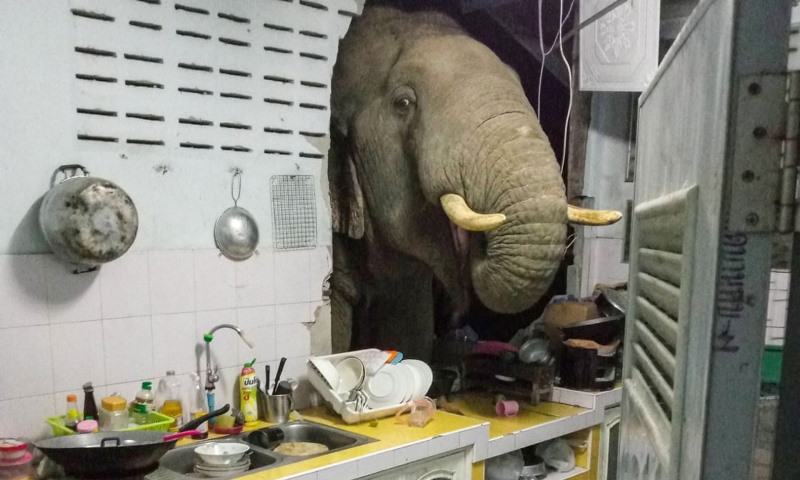 Un elefante irrumpe por comida en la cocina de una casa de Hua Hin, Tailandia. El elefante es un símbolo nacional en Tailandia, muy ligado a su historia y la realeza. Incluso, los ejemplares blancos son considerados sagrados desde hace más de 5.000 años. Esa veneración generó que algunos reyes, cuando querían hundir en la pobreza a algún ciudadano que no les agradaba, les dieran en guarda un elefante blanco, con la obligación cuidarlo y darle los mejores alimentos, lo que acababa empobreciendo su economía familiar. De esa aviesa costumbre deriva la definición de “elefante blanco” con que en todo el mundo se conoce a los grandes edificios y proyectos que fracasaron o nunca prosperaron.
