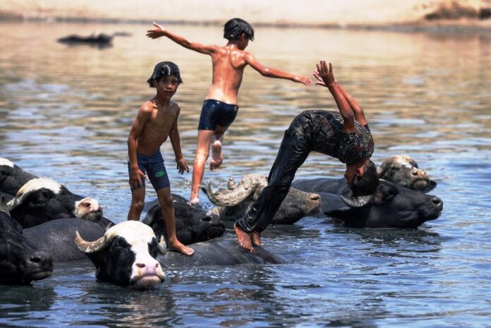 Los niños se zambullen en el río usando a los búfalos como plataformas, en el valle del río Alto Diyala, en el noreste de Irak. Las temperaturas extremas de verano son una invitación al chapuzón para los más chicos, mientras los adultos excavan las barrancas cercanas en busca de restos arqueológicos para venderlos en el mercado negro. El reciente descubrimiento de ánforas y jarras de 3.500 años disparó la cacería de objetos entre los pobladores. También confirmó que en esa zona de la Mesopotamia disfrutaron de beber cerveza de cebada, al igual que lo hacemos hoy, por lo menos desde la Edad del Bronce. Utilizando la cromatografía de gases se detectó en los recipientes un conjunto de compuestos muy parecidos a la cerveza moderna. Se cree, incluso, que la cerveza fue creada allí durante el período neolítico temprano, alrededor del 9.550 A.C.