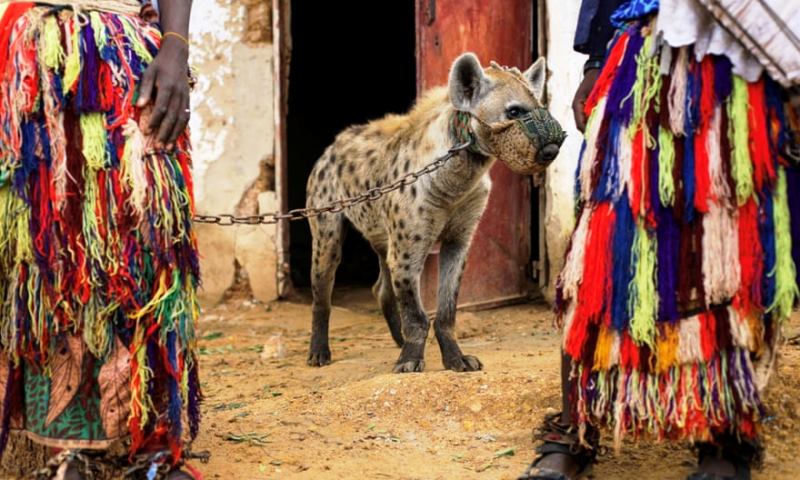 Una hiena manchada mantenida como mascota, se exhibe en un festival, Kano, Nigeria. El estiércol y la saliva de las hienas son utilizados como remedios en la medicina tradicional entre algunos grupos étnicos del este de África. Pero amaestrar a una hiena es un proceso cruel y dificultoso. Quienes se dedican a esto, las atrapan antes de que el cachorro cumpla un mes de nacido. Una vez lo tienen en su poder le administran un poderoso sedante sacado de una planta nativa. A los dos años y después de una implacable dieta compuesta de hechicerías, palizas, toneladas de carne e insultos, el animal ya reconoce y respeta a su amo.