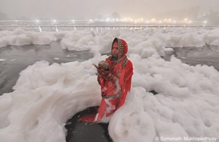Una mujer se baña en uno de los ríos más sagrados de la India, cubierto por lo que parece una gruesa capa de nieve. Pero no es nieve. Un largo tramo del río Yamuna está tapado por una blanca espuma tóxica, causada en parte por los contaminantes que vierten las industrias ubicadas en la periferia de Nueva Delhi. De cualquier forma, cientos de devotos hindúes se adentran hasta las rodillas e incluso se sumergen por completo para un baño sagrado. El Yamuna, de 1.376 kilómetros, proporciona más de la mitad del agua de Nueva Dehhi, donde residen 20 millones de personas. Se ha contaminado más con el paso de los años, una vez que las cloacas de la ciudad, los pesticidas agrícolas de estados vecinos y los desechos industriales de las fábricas van a parar a su cauce. En una ciudad que ya tiene el aire más contaminado del mundo, una vía fluvial insalubre es motivo de alarma, pero para los devotos “la vida sigue”.