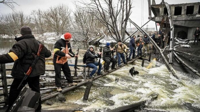 Milicianos ucranianos pasan un puente volado al norte de Kiev, armados con rifles de asalto. Al menos 536 civiles, incluidos 13 niños, han sido asesinados desde el 24 de febrero, según la Oficina del Alto Comisionado de Derechos Humanos de las Naciones Unidas, aunque los investigadores advierten que es probable que el número real sea mucho mayor. Rusia, a su vez, denuncia que los “civiles ucranianos caídos en combate” son en realidad “mercenarios”.