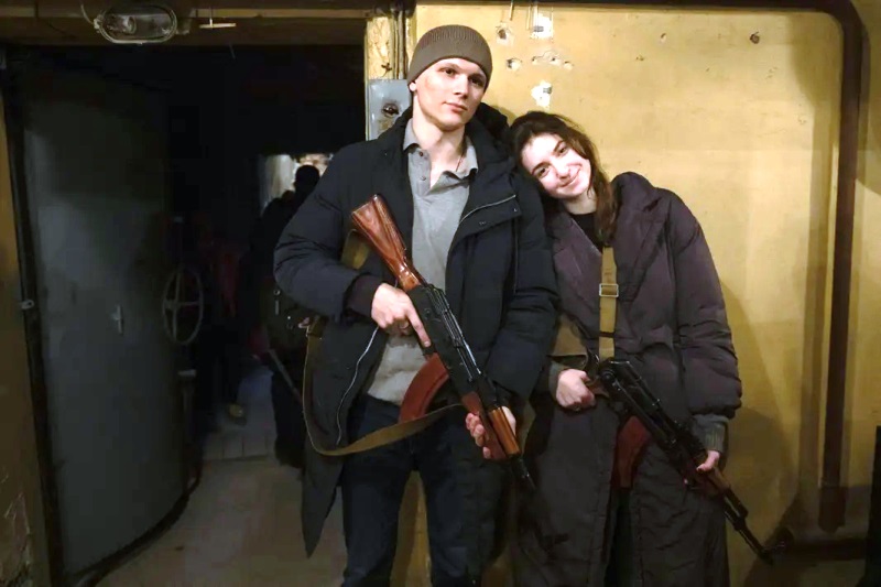 La pareja de recién casados Svyatoslav Fursinb y Yarina Arieva posan para una fotografía después de unirse a las filas de la defensa territorial de la ciudad el día después de casarse en Kiev. Miles de civiles voluntarios, algunos sin preparación militar, recibieron armas y se unieron a diversos grupos de defensa territorial. Para ser distinguidos, estos combatientes portan brazaletes amarillos. Según el gobierno son 130.000 los integrantes de las llamadas Fuerzas de Defensa Territorial que han sido destinados a equipar el segundo círculo de la resistencia en la capital de Ucrania.
