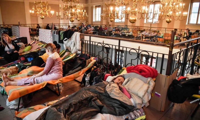 Refugiados de Ucrania descansan en un refugio temporal en la principal estación de tren de la ciudad de Cracovia, en Polonia. El número de personas que huyen de la invasión de Rusia ha superado los 1,5 millones, lo que la convierte en la crisis de refugiados de más rápido crecimiento en Europa desde la Segunda Guerra Mundial, según las Naciones Unidas. Con enormes colas de autos de quienes huyen de los combates atascados en las carreteras y trenes de evacuación abarrotados, con espacio apenas para estar de pie y sin lugar para todos, en tan sólo 10 días más del 3% de la población de Ucrania se ha convertido en refugiada. El domingo, las personas que han ingresado a Polonia desde el 27 de febrero alcanzaron el millón.